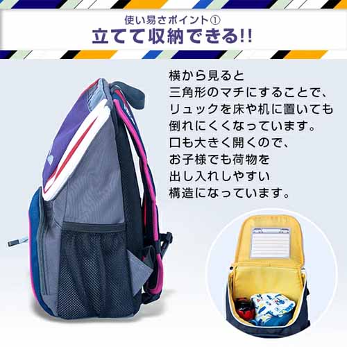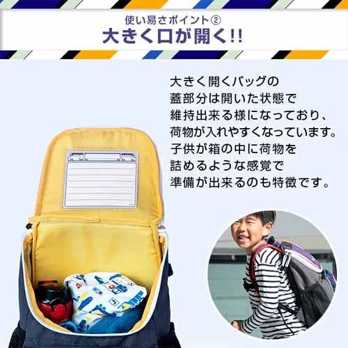 大きく開くバッグの蓋部分は、開いた状態で維持できるようになっていて荷物の入れやすさが◎。三角形のマチを広げると立てて置くことができ、バックル式ベルトなのでフックにも引っ掛けることができます。撥水性の生地で雨の日の登園にも対応します。