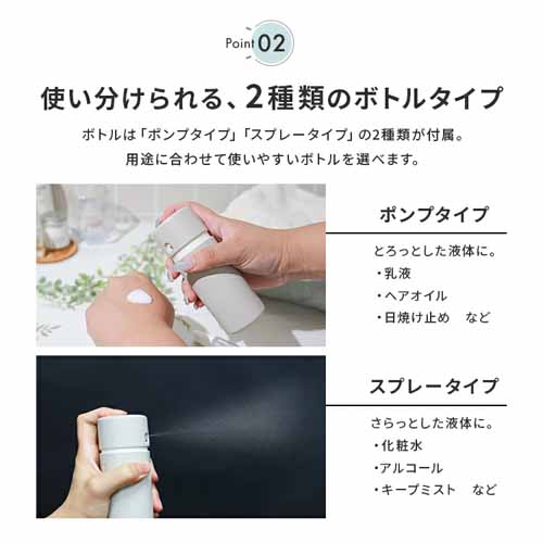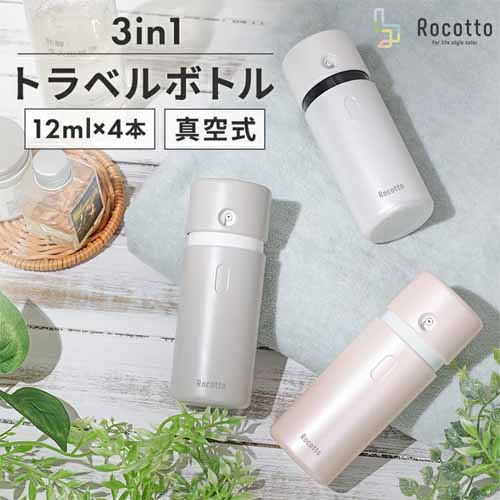 3つのボトルが収納可能な3in1のトラベルボトルです。蓋を回転させて噴射したい液体を選ぶタイプなので、一つひとつボトルを取り出す必要がなくサッと使えます。内部のボトルは真空式で衛生的に使え、中身が押し出されて最後まで使いきれます。