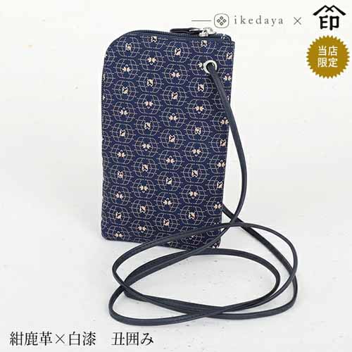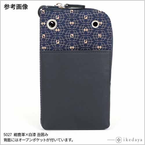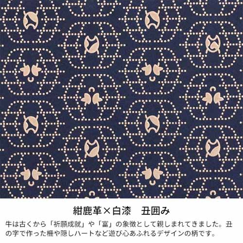 使いこむほど手に馴染み、牛革よりも軽く耐久性のある紺鹿革。白漆で文様を施す伝統的な印傳技法が採用され、味わい深い仕上がりになっています。メイン収納に加え、カードポケットと背面オープンポケットが付いて収納力も十分。