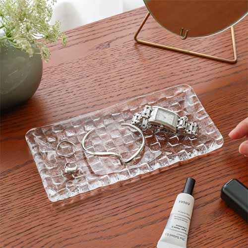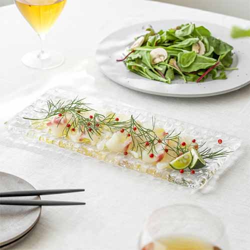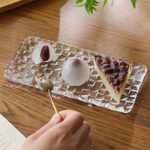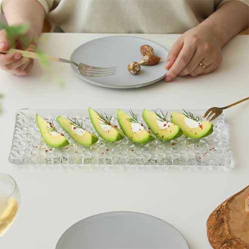 透明感のあるガラスに格子状のデザインを施したスクエアプレート。光を受けて繊細にきらめき、料理をより美味しそうに見せます。ピンチョスやチーズ、前菜の盛り付けに適したサイズ感で、日常からおもてなしまで幅広く活躍します。