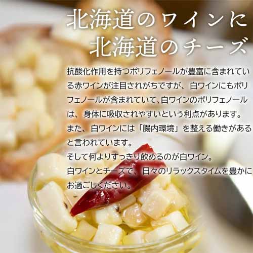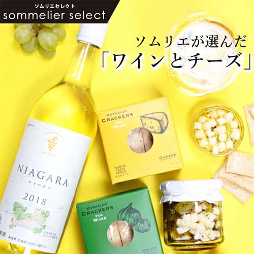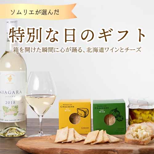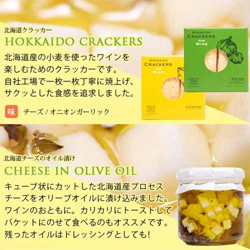 フルーティーで爽やかな甘口白ワイン「ナイヤガラ」と、北海道産素材にこだわるNORTH FARM STOCKのチーズやクラッカーをセット。チーズのオイル漬けはそのままでも、アレンジでも楽しめます。開けてすぐにペアリングが完成する手軽さも魅力です。