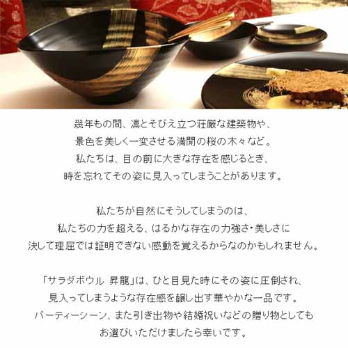 宮内庁御用達として知られる老舗・山田平安堂は、伝統技術と現代の感性を融合した漆器ブランド。黒漆に金の刷毛目が映えるデザインは、「天空を舞う龍」を表現した優雅な仕上がりです。深さのある形状で、ワインクーラーとしてもサラダボウルとしても使える汎用性が魅力。