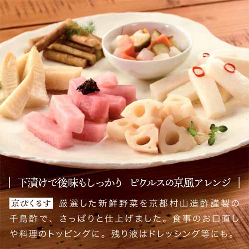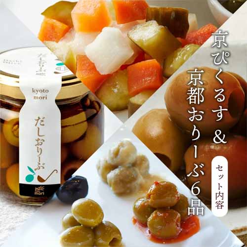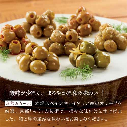スペイン・イタリア産オリーブを独自製法で漬けた「京都オリーブ」と、村山造酢の酢を使用した和風ピクルスのセット。さっぱりとした味わいで口直しにも最適です。素材の風味を活かした上品な味付けで、和洋どちらの食卓にもなじみます。