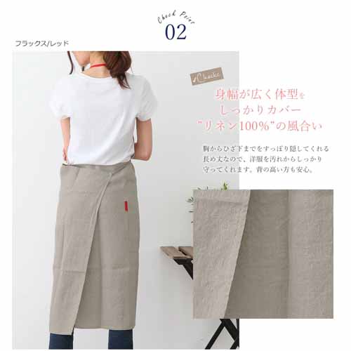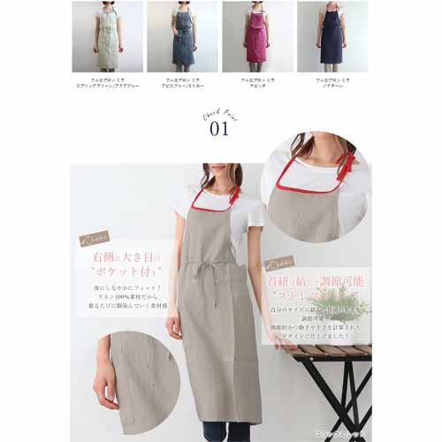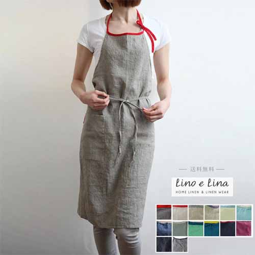 リネン100%ならではのナチュラルな風合いと軽やかな着心地が特徴。首紐は調節可能で、大きめポケット付きなど機能性も充実しています。胸元から膝下までしっかり覆う丈感で実用性が高く、使うほどに柔らかくなじむ素材感も魅力です。