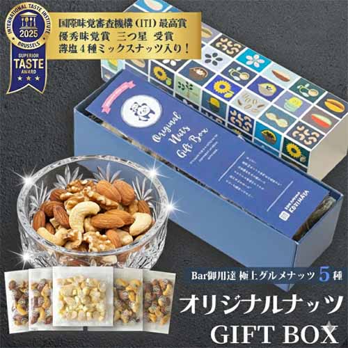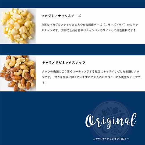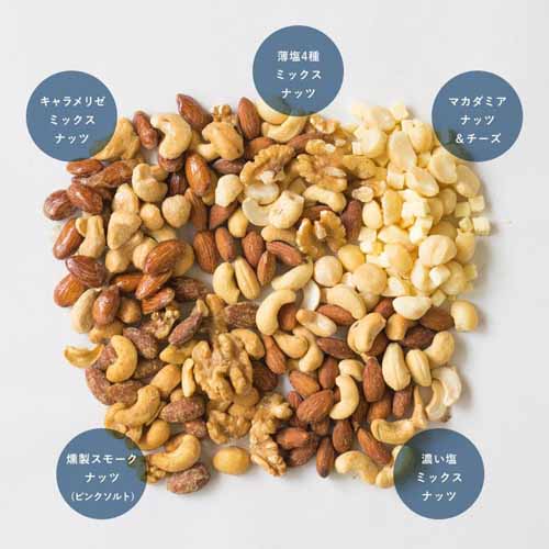 マカダミアナッツやカシューナッツなど厳選素材を使用し、素材の甘みを引き立てる薄塩仕立て。燻製ナッツやチーズ入りなどバリエーション豊かで、食べ比べも楽しめます。小分け包装で食べやすく、可愛らしいボックスデザインもプレゼント向きです。