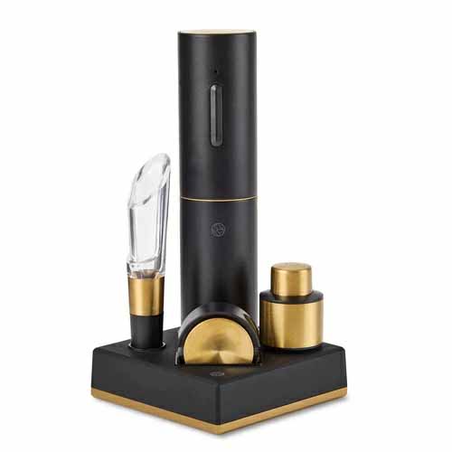 ボタン操作だけで数秒でコルクを抜ける電動スクリューに加え、ホイルカッター、エアレーター、真空ストッパーをセット。1回の充電で最大約30本対応と実用性もバツグンです。ゴールドの装飾が映えるスタイリッシュなデザインで、収納ベース付きなのも嬉しいポイント。