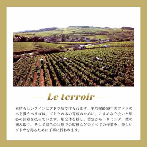 平均樹齢50年の葡萄を使用し、オーガニックに近い環境で丁寧に栽培。白い果実の香りとほのかな樽香、長く続くミネラル感が特徴です。透明感のある味わいで、シーフードや前菜との相性が良く、食卓を上品に引き立てます。