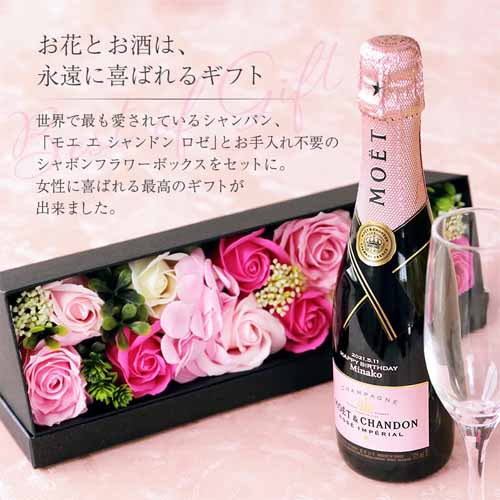特別な日にふさわしい王道シャンパン「モエ・エ・シャンドン ロゼ」と、枯れない花・シャボンローズの組み合わせは、華やかさとロマンを合わせ持つプレゼント。ピンクの色合いは愛や祝福の象徴で、結婚祝いや記念日にぴったり。名入れ対応で、唯一無二の贈り物になります。