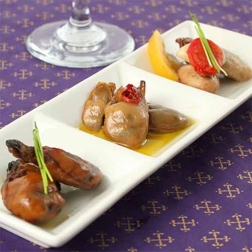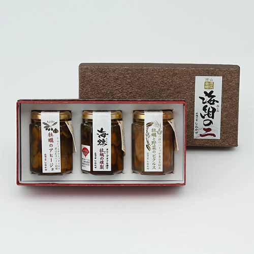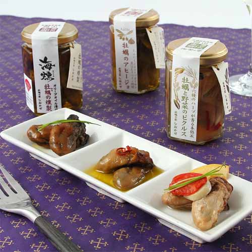 瀬戸内・虫明産の大粒牡蠣を使用し、アヒージョ・燻製オイル漬け・ピクルスの3種をセット。にんにくやハーブの香りが引き立ち、そのままでもバゲットと合わせても楽しめます。瓶詰めで保存性も高く、手軽に本格的な味わいを堪能できます。