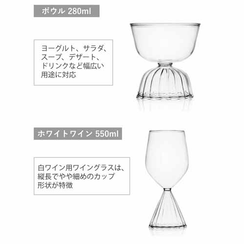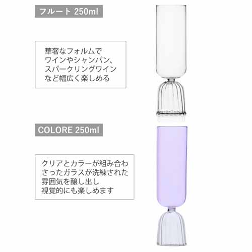 軽やかで薄いガラスと美しい曲線が特徴の「TUTU」シリーズ。細長いフォルムが泡立ちを美しく保ち、スパークリングワインにも最適です。食洗機対応で扱いやすく、日常使いからおもてなしまで幅広く活躍します。