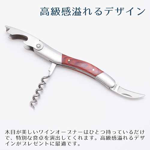 ラベルカッターと栓抜き兼用サポーターが付いた実用性の高い設計で、コルクをスムーズに引き抜けます。木目調のレッドボディは重厚感があり、使うほどに手に馴染むことも魅力。木箱には名前やメッセージを刻印でき、開封前から特別な体験を演出します。