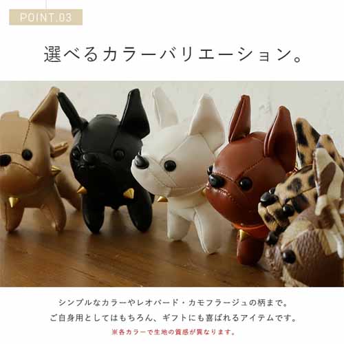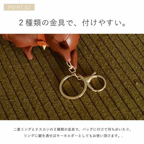 つぶらな瞳が印象的なフレンチブルドッグのぬいぐるみチャームは、細やかなステッチが施された丁寧な作りが魅力。合成皮革を使用しており大人っぽい質感が楽しめます。ナスカンとリングの2種類の金具が付属しているため、バッグやポーチなど取り付ける場所に合わせて使えることも便利。
